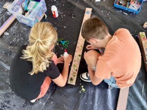 We maken zowel eigen werkstukken als gezamenlijk werk: een groot schilderij, een grote verzameling van drukwerkjes van karton en touw, een groot 3d werk, en nog veel meer. Je mag je eigen werk natuurlijk mee naar huis nemen. De gezamenlijke werken komen in de galerie te staan tot 5 januari 2026.